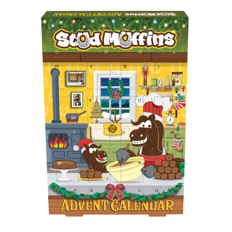 24 okienka symbolizujące adwentowe dni grudnia zawierają świąteczne mufinki o smaku puddingu.