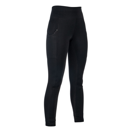 Wykonane z wysokiej jakości materiałów. Odporne na odkształcenia i blaknięcie. Bardzo elastyczne, świetnie układają się na ciele, nie krępując ruchów jeźdźca. Tkanina błyskawicznie odprowadza wilgoć ze skóry i szybko wysycha, pozostawiając przyjemne uczucie świeżości nawet podczas intensywnych treningów. Podszyte ciepłym i miłym w dotyku polarem, który gwarantuje komfort termiczny w zimowe dni. Pełny silikonowy lej świetnie trzyma w siodle i pomaga utrzymać prawidłowy dosiad. Podwyższony stan z szerokim pasem ładnie przylega, podkreślając talię i zapobiegając zsuwaniu. Wyposażone w pojemne kieszenie na obu udach, ozdobione drobnymi kryształkami, idealne do przechowywania telefonu i innych drobiazgów.