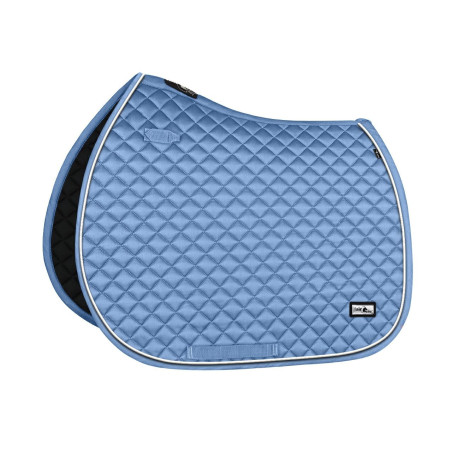 Klasyczny czaprak wykończony srebrnym pipingiem, podszyty oddychającym i łatwym w praniu podszyciem z siateczką.