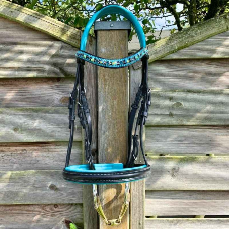 Wykonane z wysokiej jakości, wytrzymałej skóry. Wyjątkowe ogłowie, który łączy w sobie nowoczesny design, komfort oraz wysoką jakość wykonania. Wyróżnia się efektownym połączeniem czarnej skóry z intensywnie turkusowym podszyciem, które nie tylko przyciąga wzrok, ale także zapewnia komfort noszenia dla konia dzięki miękkiemu wykończeniu w okolicach potylicy i nachrapnika. Najbardziej charakterystycznym elementem tego ogłowia jest bogato zdobiony nachrapnik oraz naczółek – mieniące się kryształki w odcieniach niebieskiego, turkusu i bieli nadają mu elegancji i wyjątkowego charakteru. Ogłowie posiada anatomicznie wyprofilowaną część potyliczną, co zmniejsza nacisk na wrażliwe miejsca głowy konia i zwiększa komfort użytkowania. Doskonale sprawdzi się zarówno na co dzień, jak i podczas zawodów, stanowiąc stylowy i funkcjonalny element wyposażenia każdego jeźdźca.
