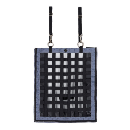 Worek na siano z siatką z przodu, składający się z szerokich pasów tkaniny.