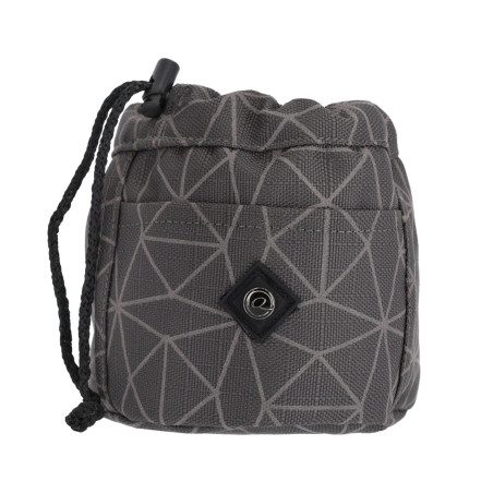 Wykonana z mocnego, wodoodpornego materiału. Idealna do przechowywania cukierków i innych smakołyków podawanych jako nagroda podczas pracy z koniem lub innym pupilem. Z przodu znajduje się niewielka kieszonka zapinana na rzep. Górę torebki można zamknąć poprzez zaciągnięcie sznureczka ze stoperem, aby smaczki nie wypadły podczas jazdy. Torebka wyposażona jest w nieduży, wytrzymały karabińczyk w kolorze czarnym, który można podpiąć w dowolnym miejscu i szlufkę do przełożenia paska od spodni. Ozdobiona stylowym, przyciągającym wzrok wzorem oraz eleganckim znaczkiem z logo producenta.