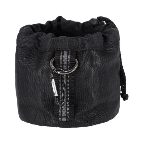 Wykonana z mocnego, wodoodpornego materiału. Idealna do przechowywania cukierków i innych smakołyków podawanych jako nagroda podczas pracy z koniem lub innym pupilem. Z przodu znajduje się niewielka kieszonka zapinana na rzep. Górę torebki można zamknąć poprzez zaciągnięcie sznureczka ze stoperem, aby smaczki nie wypadły podczas jazdy. Torebka wyposażona jest w nieduży, wytrzymały karabińczyk w kolorze czarnym, który można podpiąć w dowolnym miejscu i szlufkę do przełożenia paska od spodni. Ozdobiona stylowym, przyciągającym wzrok wzorem oraz eleganckim znaczkiem z logo producenta.